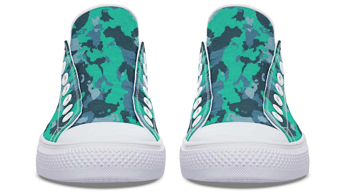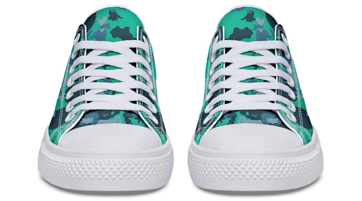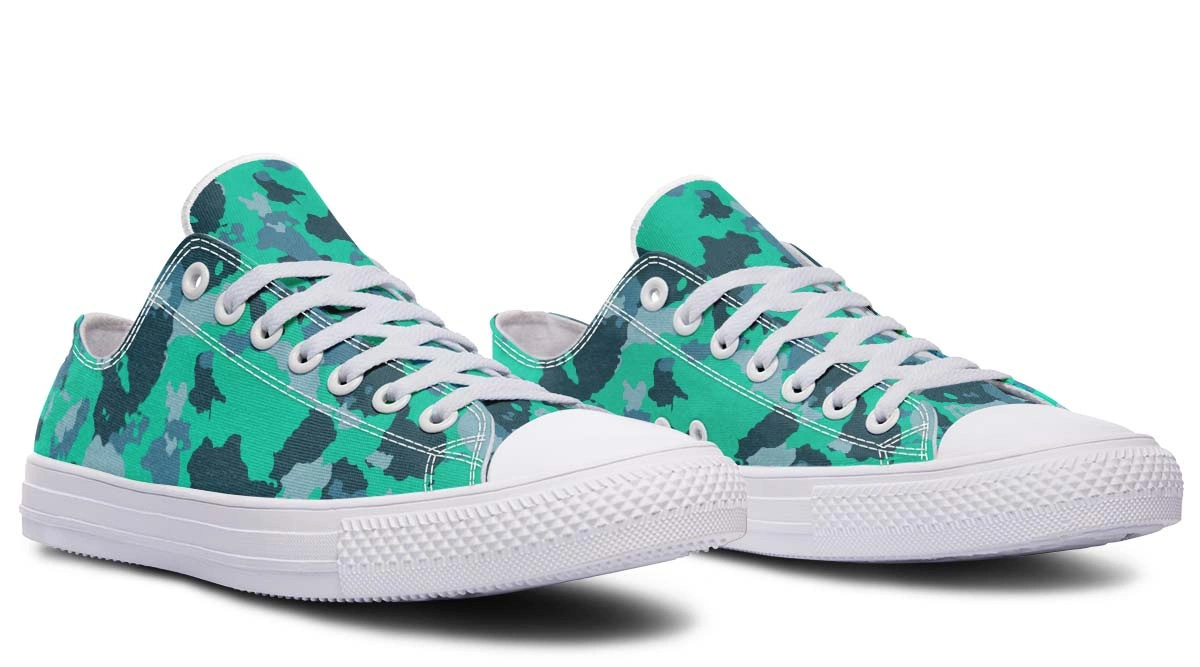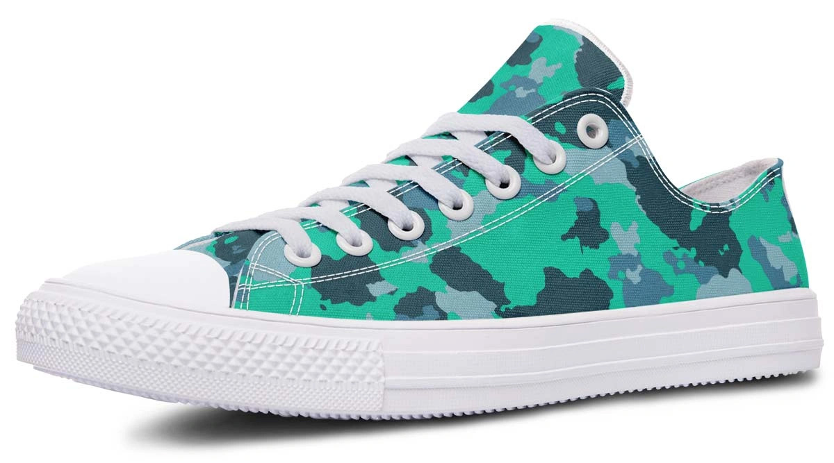 Add a splash of color to your footwear collection with our Cyan Camo Pattern White Low-Top Sneakers. These eye-catching shoes feature a vibrant cyan and blue camouflage motif set against a clean white background, making them the perfect centerpiece for any casual outfit. Engineered for comfort, the sneakers include a soft lining and a flexible sole that moves with you. The low-profile silhouette offers a timeless look, while the unique pattern ensures you stand out from the crowd. Perfect for summer outings, gym sessions, or everyday wear, these sneakers are as versatile as they are stylish.
